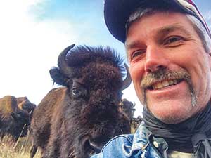 Photo caption top: Dr. Tom Bragg, DVM class of 1993, follows a herd of bison at Snowcrest Ranch in Montana. Photo by Aaron Paulson. Photo caption below: Dr. Bragg takes a selfie with one of the bison he calls 'Carla.'